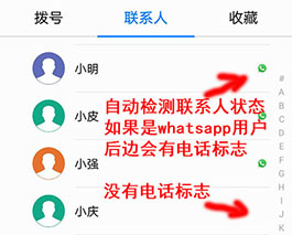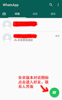 选择whatsapp标识联系人,点击信息或者通话按钮,进行一次信息发送或者语音通话,对方被自动添加到对话界面(好友)。